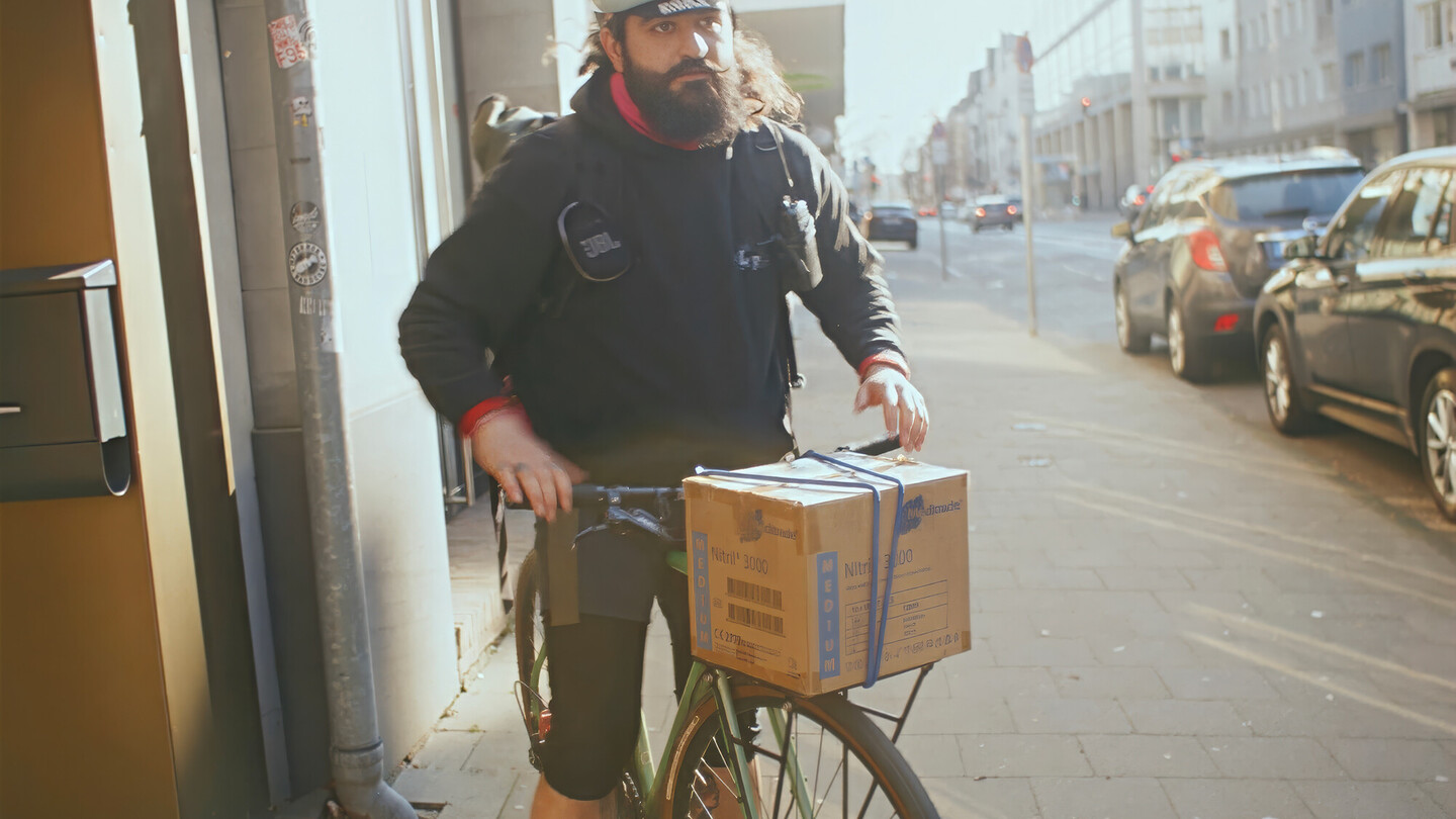Albert Rabaev is fietskoerier in Düsseldorf. In Wie der Hase läuft geeft hij ons een kijkje in zijn dagelijks leven: waarom hij van zijn werk houdt, wat hem soms gek maakt en de wildste bezorgingen die hij ooit heeft moeten doen. In zijn werk, waar tijd geld is, is druk een constante metgezel. Maar Albert gedijt goed bij het snelle ritme van het fietsen door de stad, de radioberichten en de ritjes met de lift. Hij geniet van het gevoel van vrijheid dat zijn ongewone baan met zich meebrengt – een gevoel dat hij deelt met fietskoeriers over de hele wereld.